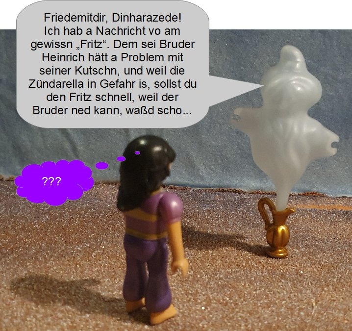 . Hier nun also das Team der Aushilfshelden: Dinharazade, die ihrer Schwester Scheherazade mit 1000 Märchen das Leben gerettet hat, und der junge Fritz, Bruder des bekannten Heinrich, des Kutschers des noch bekannteren Prinzen, des Verlobten der noch viel bekannteren Prinzessin die seinerzeit den einfach nur noch extrembekannten Frosch gegen die Wand... aber darum geht's ja gar ned...