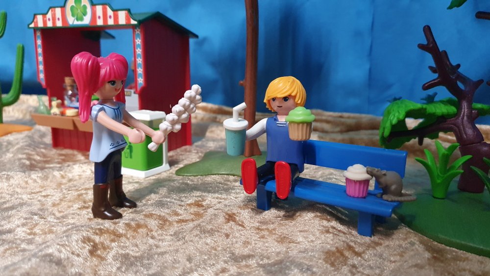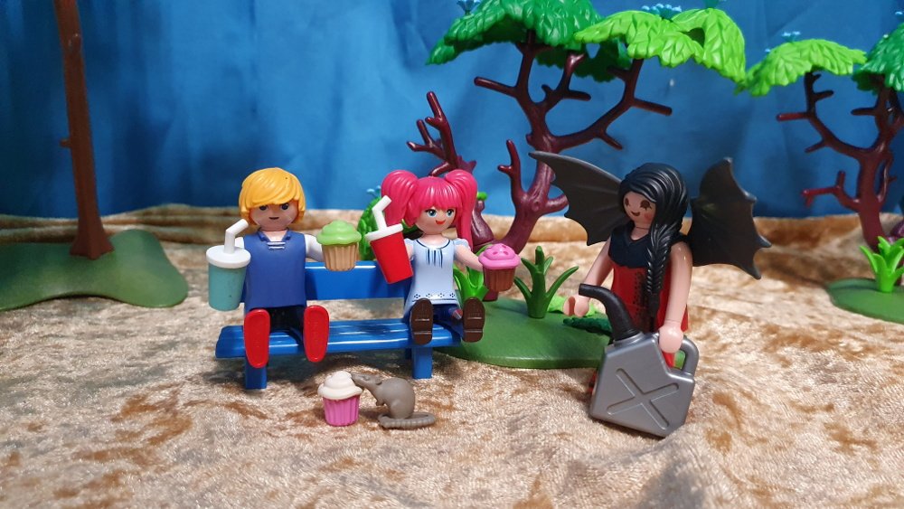 Wir sitzen noch an der Raststätte auf der Bank und genießen unseren Imbiss, als plötzlich Flatterfee neben uns steht.
