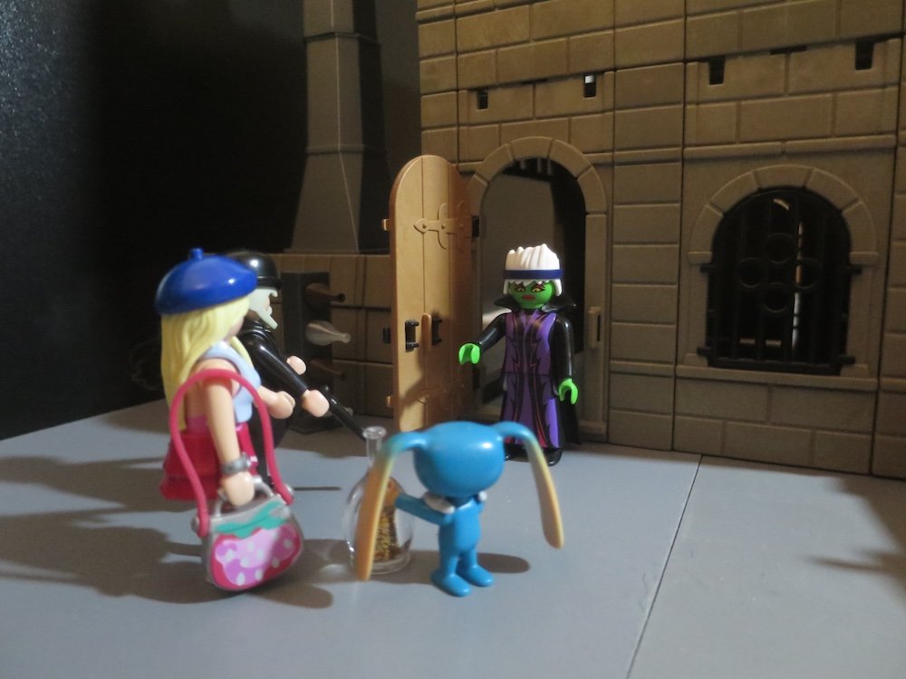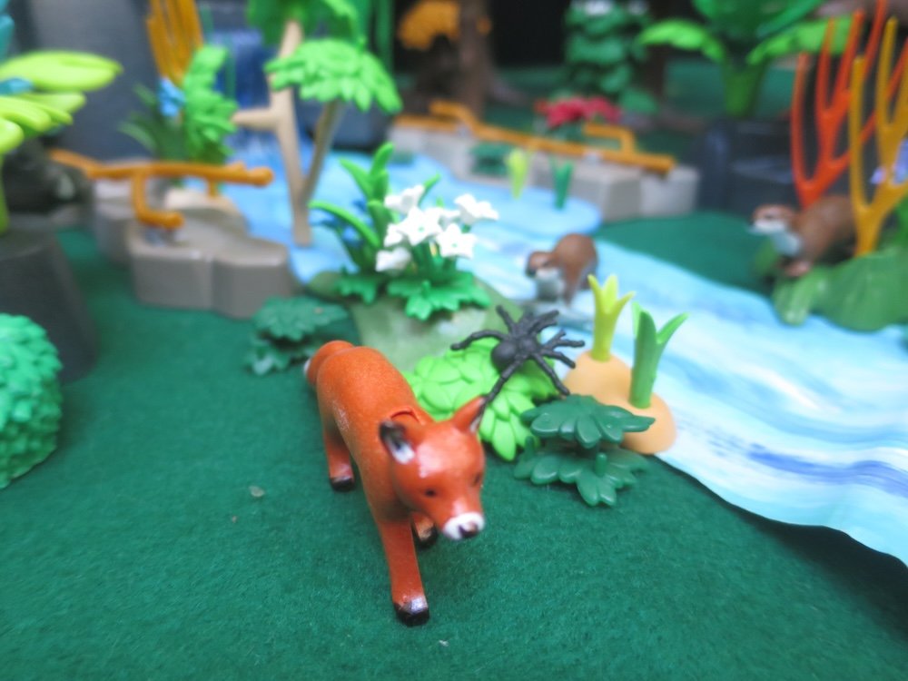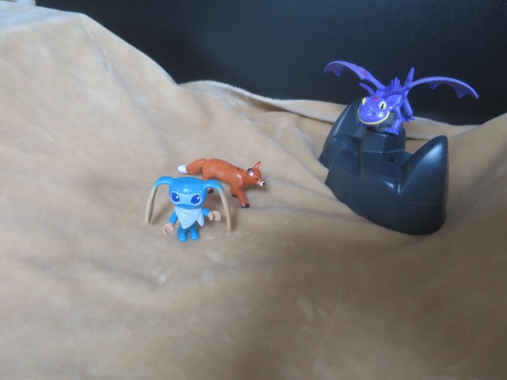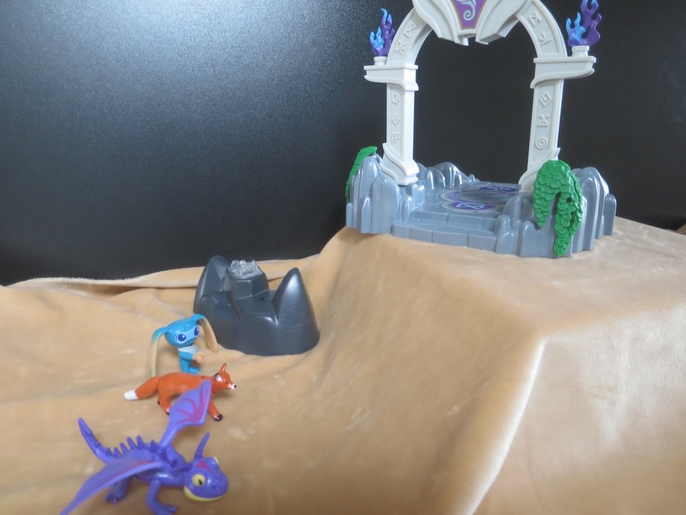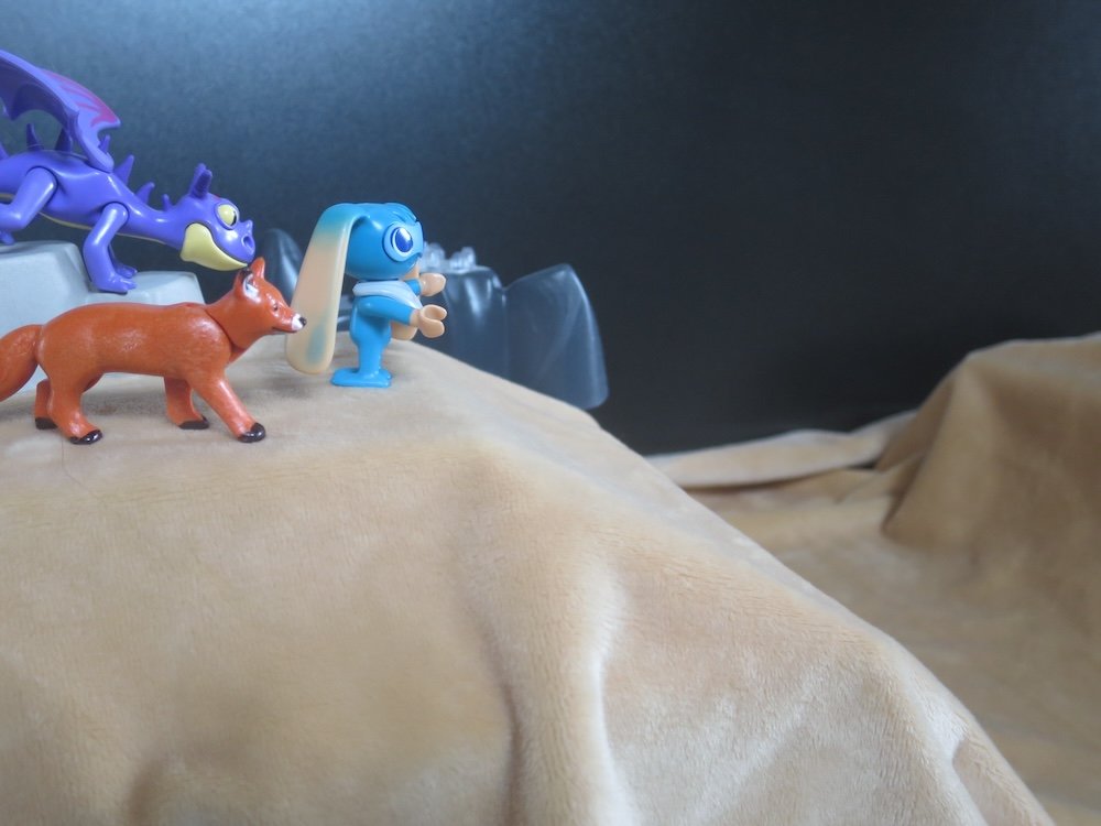 Sogar der Aufstieg in Tiergestalt haben Onkel Di und Mika mühelos geschafft. Oben angekommen schauen die Tiere sich suchend um. Der kleine Fuchs schnüffelt alles nochmals ab.