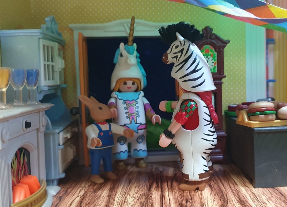Kaum habe ich das gedacht, klingelt es schon an der Tür. Draußen stehen Jolande, als Einhorn verkleidet, und Möhrchen, ganz ohne Kostüm."