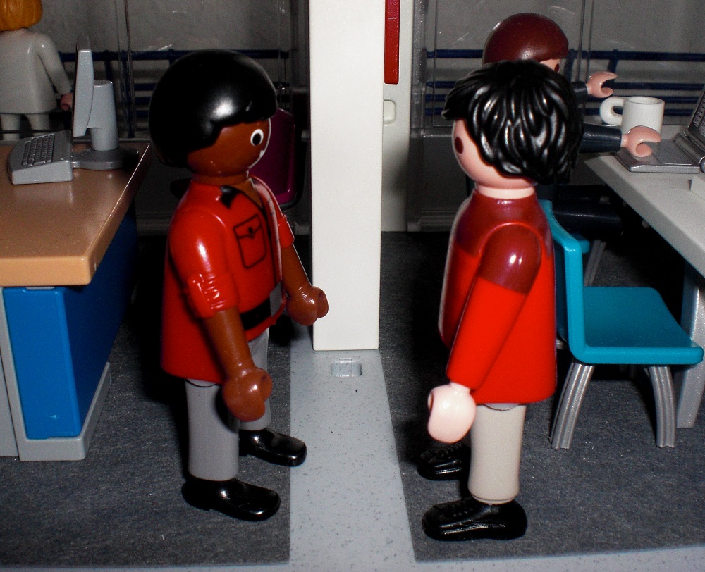„Hey Jenny, hast du kurz Zeit?“, fragt er, als er dort angekommen ist.
