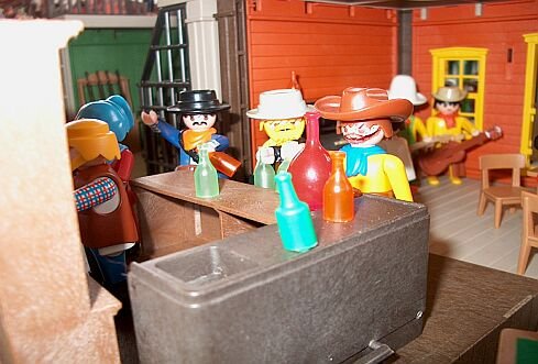 Buck und Jack beschließen noch mal in die Stadt reiten um sich ein Feierabend-Bier zu gönnen. Im Saloon ist heute Live-Musik angesagt.
