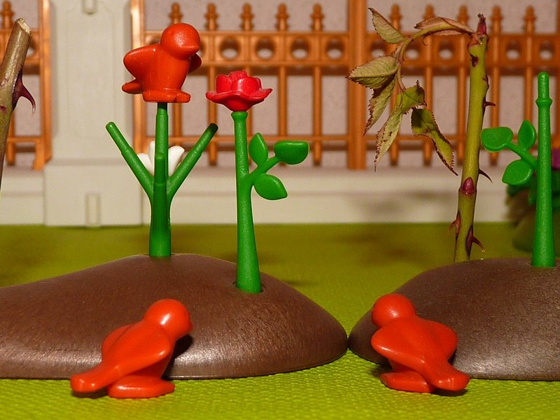 Und als sie nun die Dornensträucher sah, darüber die schwarzen Raben ein Höhenlied krächzten, da überlief sie eine Angst, ein Todesgrauen; und sie sprach: „Mein Königssohn, ich muss Euch die holde Rose wählen, sie ist die Schönste.“ Nun bewegten sich alsbald der Rose Zweige und Blätter und Blüten und verschmolzen sanft zum Körper eines lieblichen Mädchens, das keine andere war als das fromme Gärtnermädchen. Und es schien noch schöner und bescheidener als zuvor.