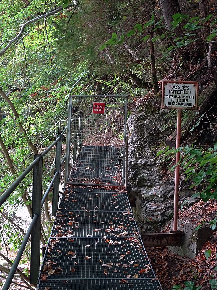 A 1: Überall sind Verbotsschilder aufgestellt worden. Sie warnen vor deM Betreten des ehemaligen Fabrikgeländes. "ACCES INTERDITE" lesen wir, und das schüchtert ein. Ein süßlich-herber Duft liegt in der Luft. Beruhigt uns das? Nicht wirklich! Die Pforte des Werkes wirkt auch nicht gerade einladend.