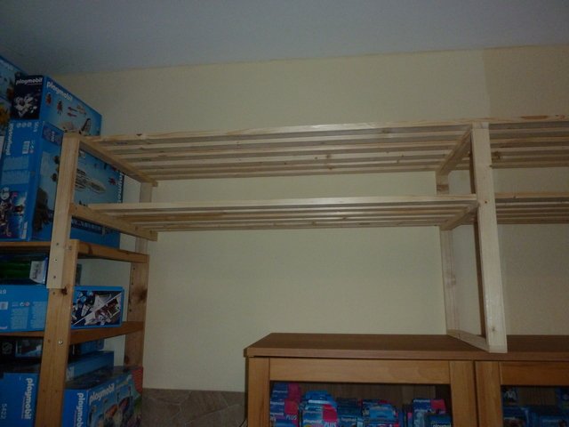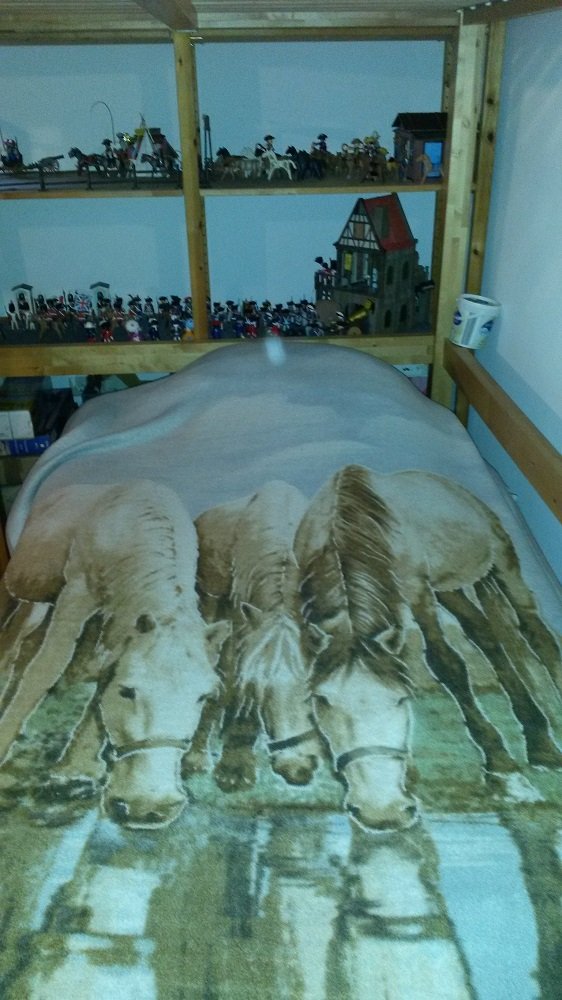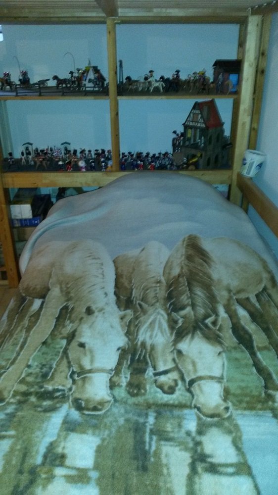 hochbett im Playmozimmer. Nicht wirklich gemütlich. Weil Zimmerhöhe mit 2,30 m einfach zu niedrig. Aber da ist mir mein Cowboy-Bett eingefallen
