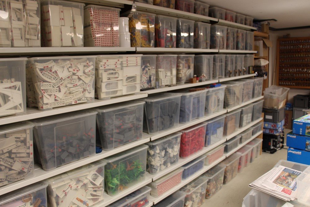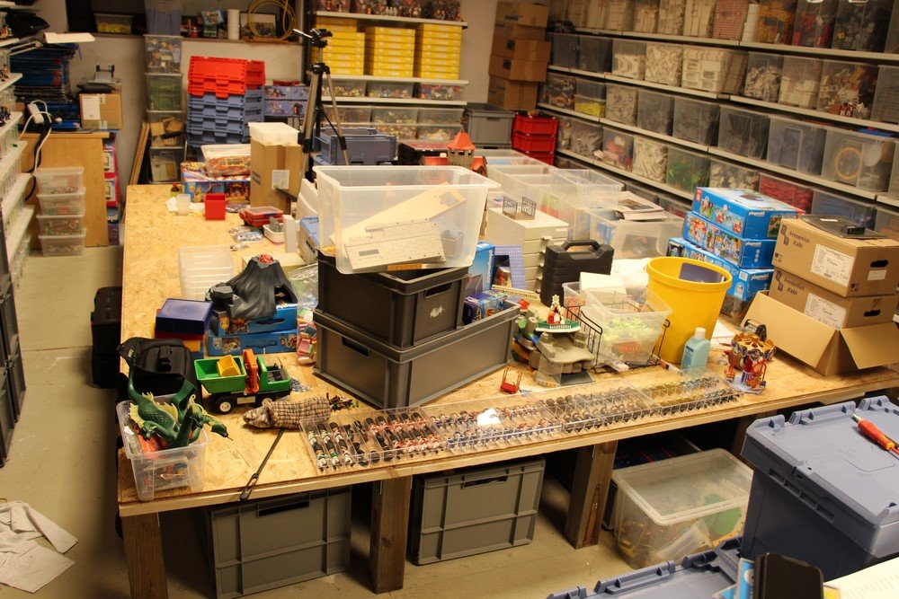 Bild 15 Bild 16 Bild 17 Bild 18 - von den grauen Kisten befinden sich je 4 Stück noch in jeder Reihe gefüllt mit Eisenbahn, Raumstation und Sys-X Bild 19 - Chaos vom derzeitigem Verkauf - demnächst wird hier wieder aufgebaut Bild 20 - hier lagert noch so einiges in der Werkstatt Bild 21 Bild 22 - blaue Kästen gefüllt mit Playmo