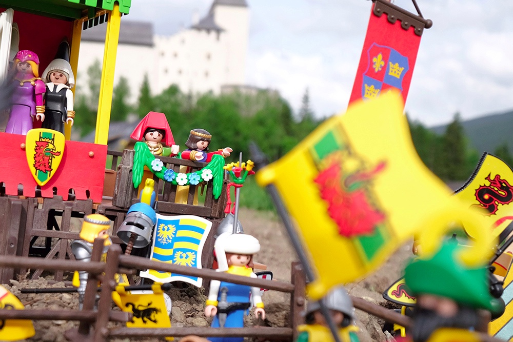 Die Edeldamen haben ihre Plätze auf den zwei Tribünen, in der Mitte überwachen die Richter sowie der "Wappenkönig" das Geschehen: