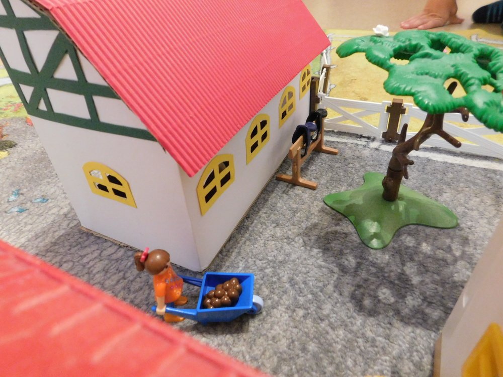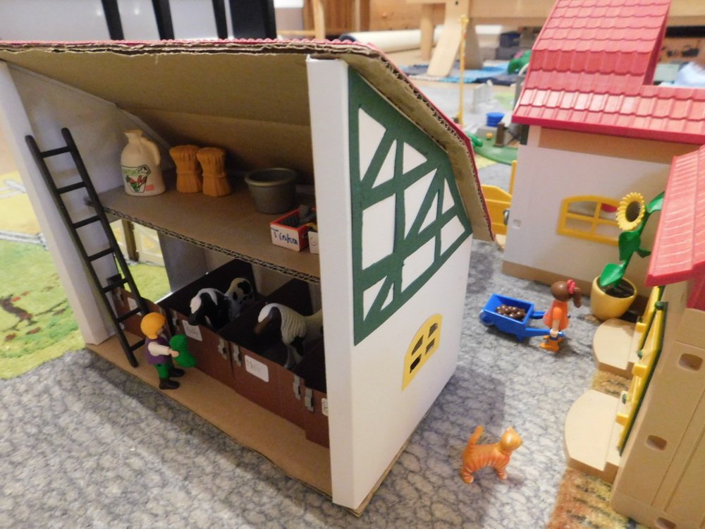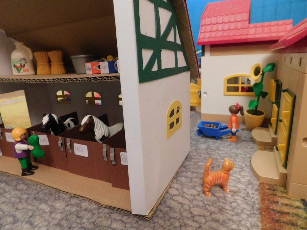 meine jüngste Tochter sagte mir, sie bräuchte unbedingt eine Scheune für ihren Playmobil Ponyhof. Also griff ich mal wieder zu Schere, Klebstoff und Karton, und was dabei heraus kam, seht ihr unten auf den Fotos. Natürlich habe ich auch wieder einen Bastelbogen für Euch zum Ausdrucken und Nachbauen erstellt. Hier könnt Ihr ihn herunterladen: Bitte beachtet die Bastelhinweise auf der 2. Seite.