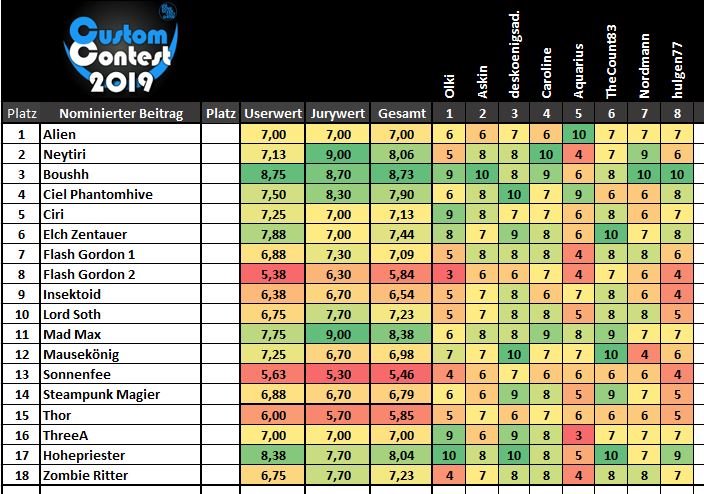 . Das erfordert viel Mut, da zur Freude des bestplatzierten auch immer die Enttäuschung des letztplatzierten gehört. Neben Lob muss man bei solch einen Contest auch immer Kritik einstecken. Das betrifft - soweit ich das in Erinnerung habe - die Favoriten wie auch die bisher nicht so gut platzierten. Es hat mir extrem viel Freude bereitet, all die Figuren zu betrachten. Obendrein hat es meinen Horizont wieder ein kleines Stückchen erweitert.