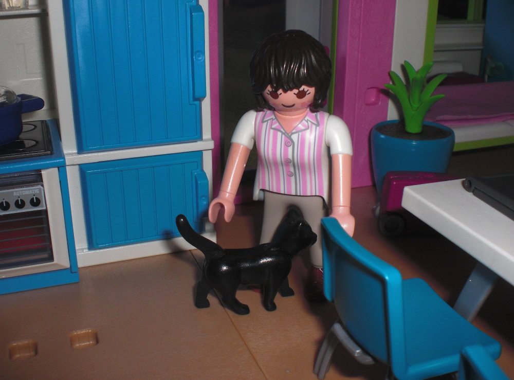 Die Katze beginnt sofort schnurrend um Jennys Beine zu schleichen.