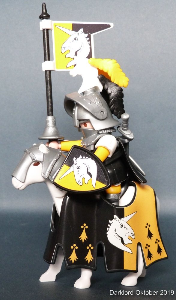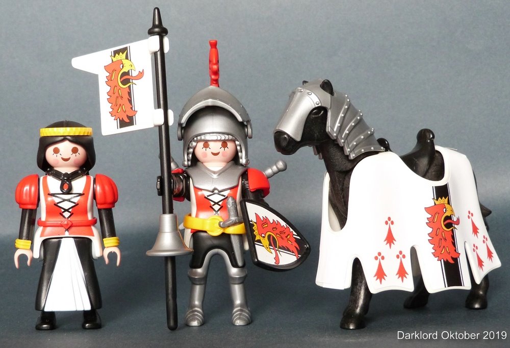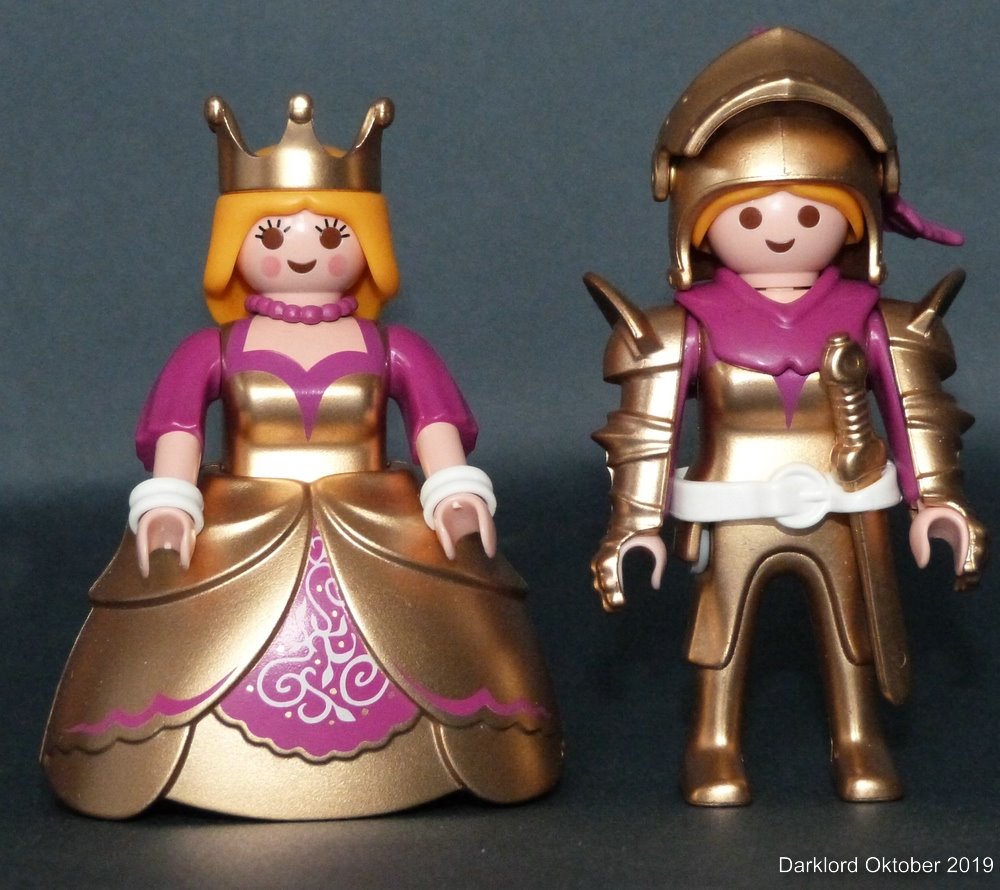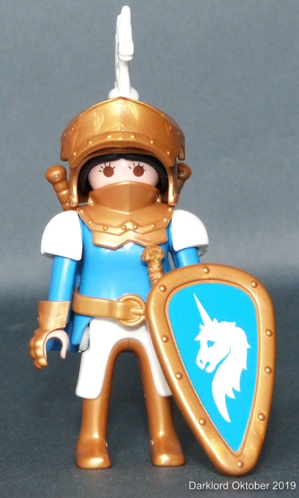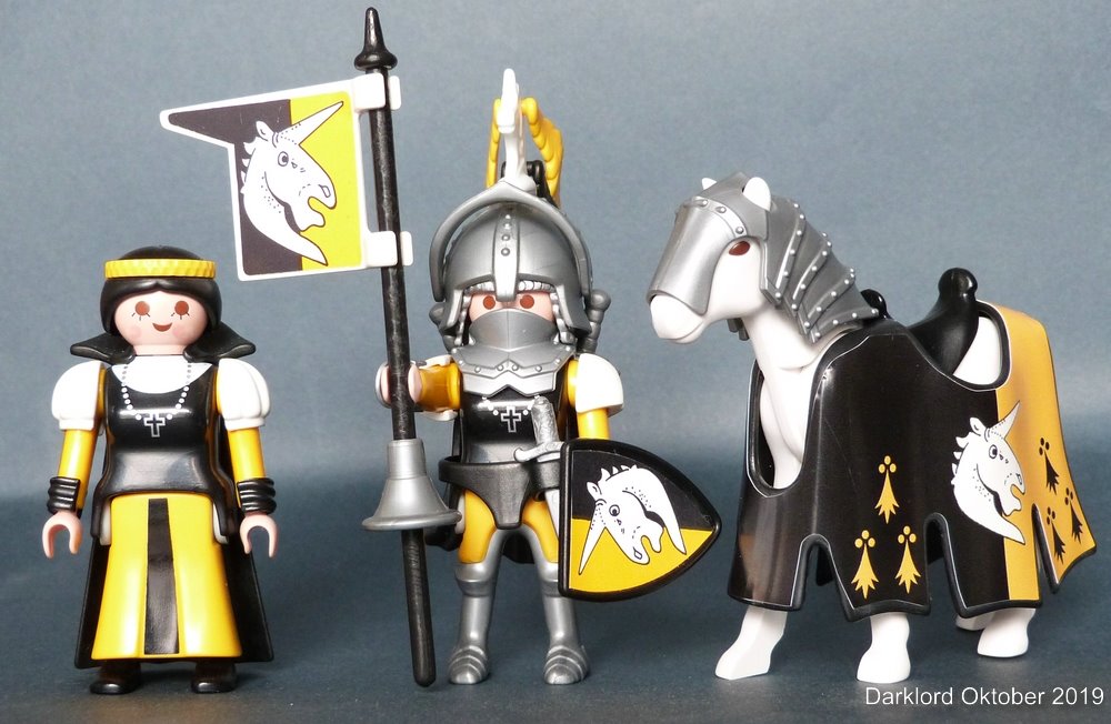 Die nächste Figurengruppe zeigt, in welche "Schwierigkeiten" man geraten kann, wenn man sich einbildet, zu einer gegebenen Zivilversion eine passende Kriegerin basteln zu können. :wirr :klonk Wenn ich auch bei der Kriegerinnen-Version nur diesen exklusiven Goldton verwenden will, kriege ich spätestens beim Pferd wieder die üblichen Probleme: Einen Kopfpanzer gibt es, eine Schabracke in dem passenden Farbton auch, aber da ist wieder kein Wappen drauf. Außerdem suche ich noch zwei ordentliche Langschwerter in dem Goldton und eine Idee für Schild und Lanze. :gruebel