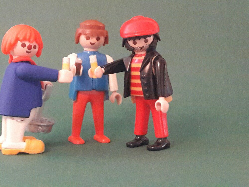 Nett, ich, allemole. Jet zo Drinke han ich och metjebrat. Do wor noch ne ahle Pittermann ( 10-ltr-Fässchen Kölsch, Anmerkung des Autors). Eins han ich erusbekumme, hät zwar en komisch Färv, ever für de Wibbelstätz jenau richtig. Un för uns han ich frisches Kölsch. Pross zosamme.