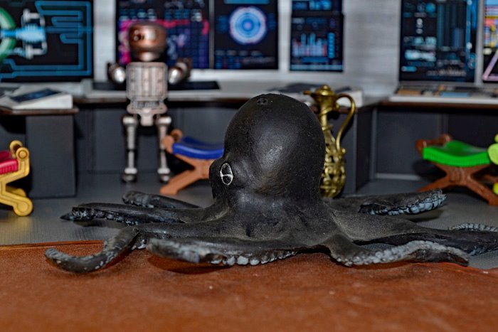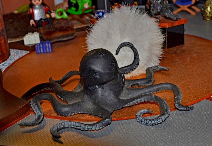 Die Tür geht auf, und herein tritt ein Fintentisch. Unscheinbares Aussehen mit vielen Armen und unglaublich großen Augen.