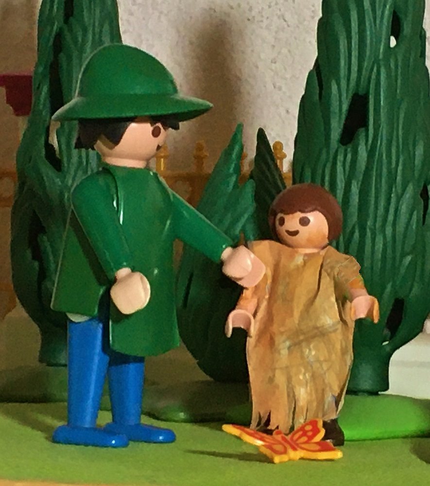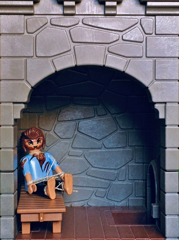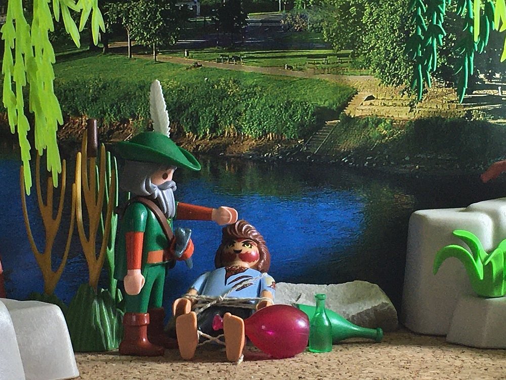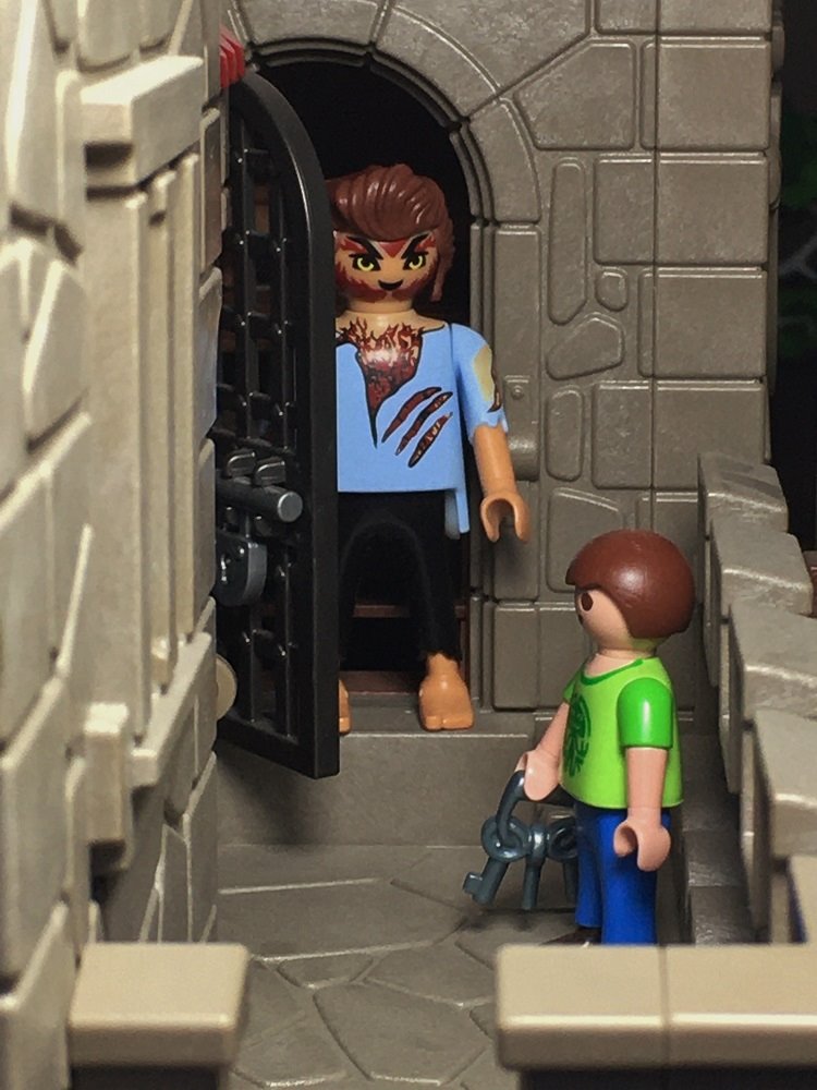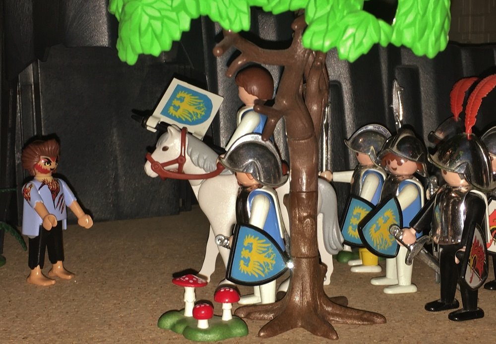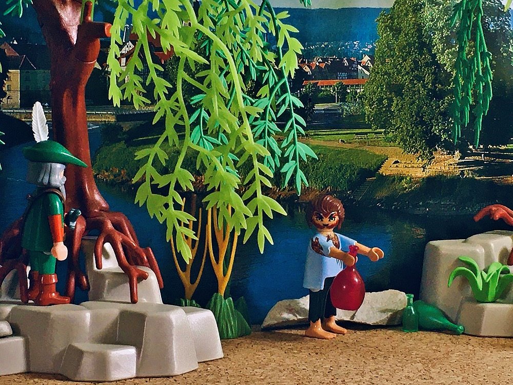 Bei diesem Märchen 'De wilde Mann', habe ich lange überlegt, welche Figur ich für den wilden Mann nehmen könnte, und hatte erst einmal keine Idee, weil die Figur hier mal das Tier, mal der wilde Mann genannt wird. Vor ein paar Wochen habe ich dann mal das Playmobilregal in unserem Spielwarenladen inspiziert, um vor allem die Neuheiten anzuschauen. Und da entdeckte ich den ''Wolfsmann'', den gibt es zwar schon länger, aber bisher hatte ich keine Verwendung dafür und er war mir nicht wirklich aufgefallen. So wurde dieser zum wilden Mann.