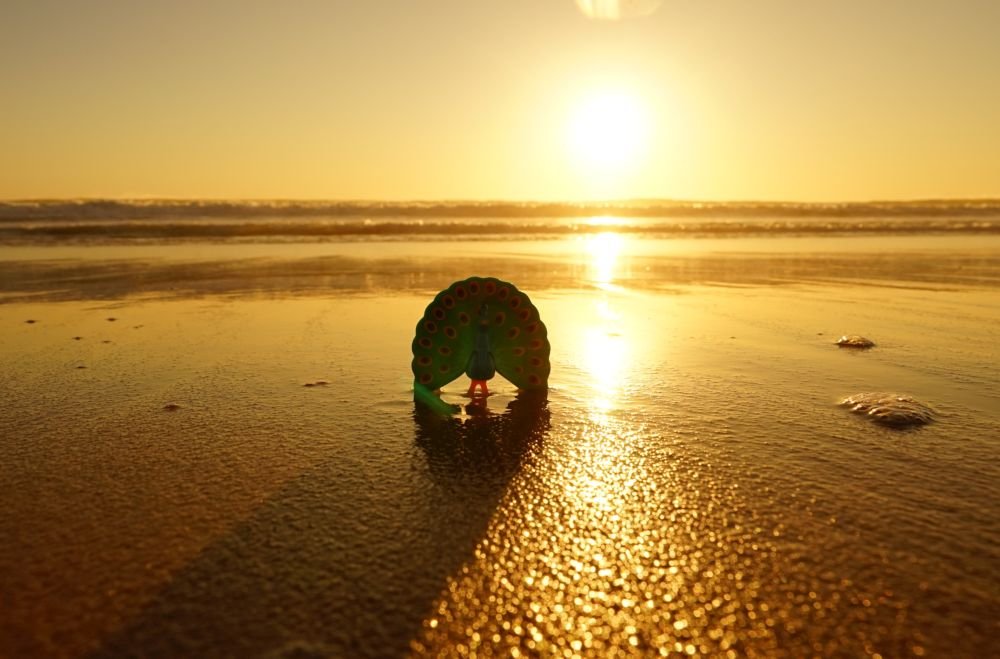 Aber auch im Sonnenuntergang macht der Pfau eine gute Figur: