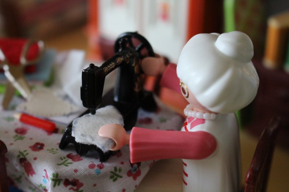 Hier haben wir schon einmal Frau Weihnachtsmann, die damit beschäftigt ist für alle einen Mundschutz zu nähen
