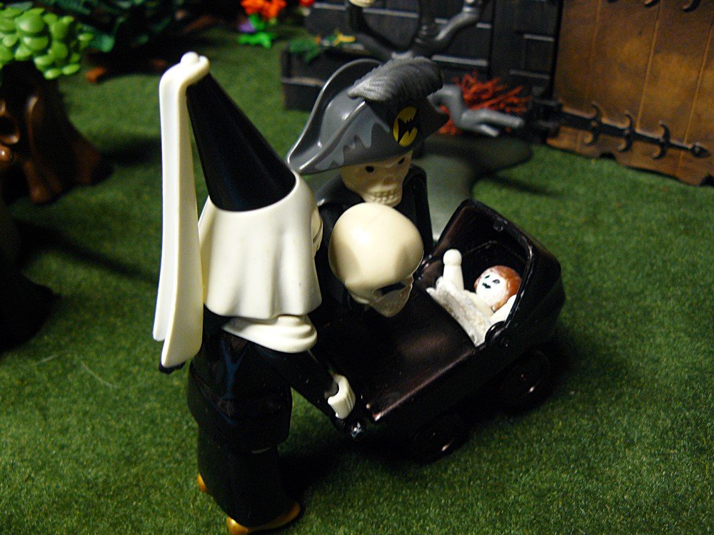 Das kleine Geisterbaby freut sich über die Faxen des Totenkopfes, tolle Klapper.