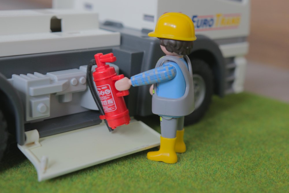 Als nächstes holt er seinen Feuerlöscher und versucht den Reifen zu löschen.