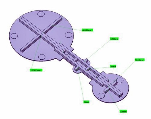 Heute mal ein Bild von der Unterseite des Dios ... Ein screen shot von den klappbaren Platten und KVH®-Stangen, die gerade am Entstehen sind. Wie immer in den Mittagspausen mit CATIA V5 konstruiert. Die kreisrunden Elemente sind die Platzhalter für die Tischbeinteller.