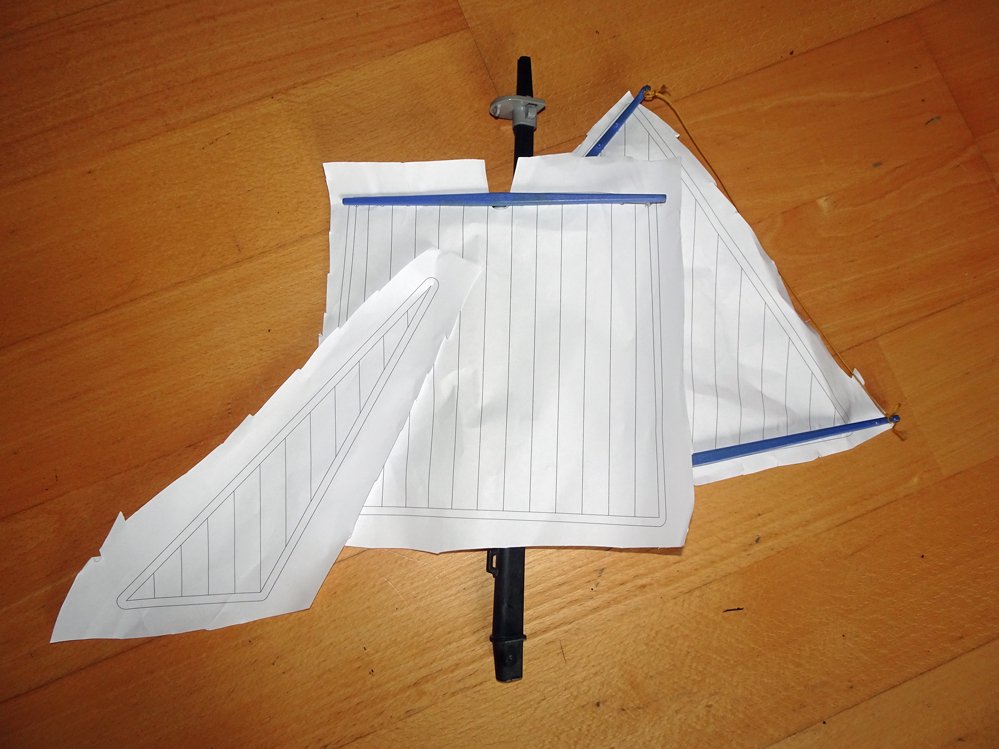 Danach wurde von mir der Segelzuschnitt digitalisiert. Der englische naval cutter erhält schwarze Segel und eine dunkelbraune Takelage (Takelgarn). Der geteerte und kalfaterte Rumpf wird ebenfalls Mumia-braun.