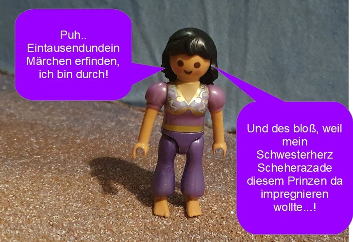 Nachdem bekanntlich die Letzten die Ersten sein werden, startet das Team der Aushilfshelden etwas verzögert... (alles Daggdigg!). Die erste Hauptperson kann nix dafür, ihre Schwester hat einen Tag länger gebraucht, als geplant. Sonst wären wir gestern pünktlich gewesen :pfeif . Hier nun also das Team der Aushilfshelden: Dinharazade, die ihrer Schwester Scheherazade mit 1000 Märchen das Leben gerettet hat, und der junge Fritz, Bruder des bekannten Heinrich, des Kutschers des noch bekannteren Prinzen, des Verlobten der noch viel bekannteren Prinzessin die seinerzeit den einfach nur noch extrembekannten Frosch gegen die Wand... aber darum geht's ja gar ned... :pfeif . Nachdem die eigentlichen Helden der Märchenwelt also irgendwie alle gerade geheiratet werden ode als Treuzeugen ihre Dienste tun müssen, startet hier die zweite Garde aus der zweiten Reihe...