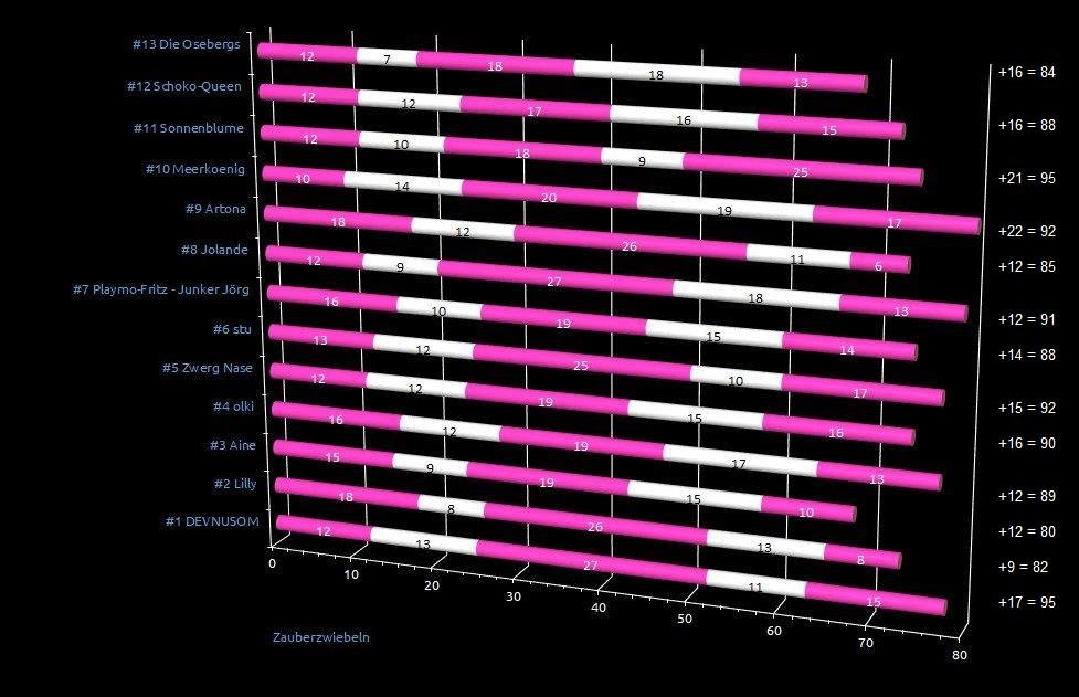 Da habe ich bei der Sonnenblume nicht richtig summiert, sie hat nicht 92, sondern 102 Zauberzwiebeln und führt zur Halbzeit deutlich mit 7 Zauberzwiebeln.