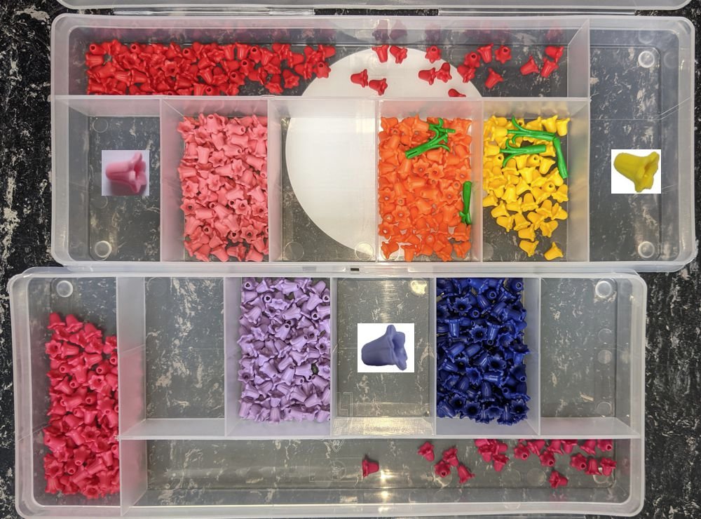 So habe ich z.B. alle gelben Blüten in einem Fach, Rosa ebenfalls und einige Blautöne. :gruebel