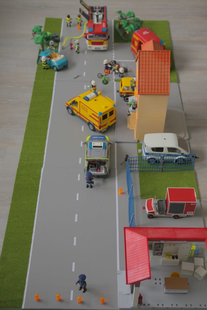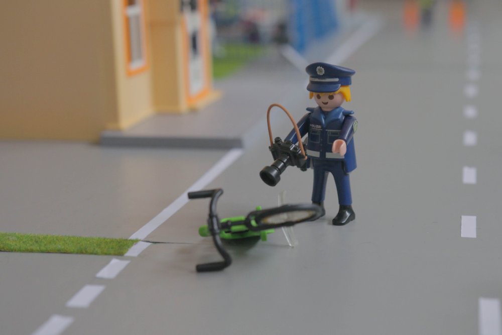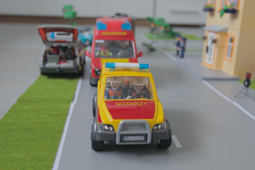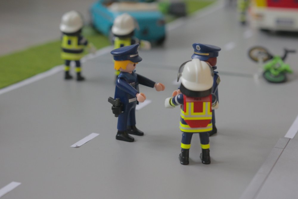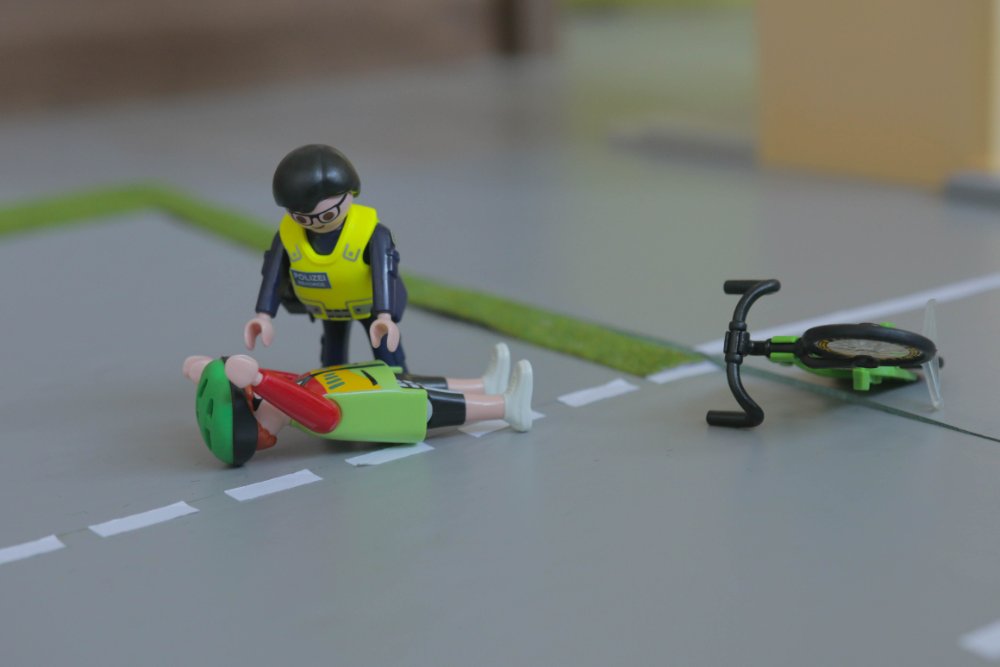 "Hi. Wir haben hier gerade den Blitzer aufgebaut, als das Cabrio viel zu schnell angekommen ist. Der hat wohl den Fahrradfahrer übersehen und ihn dann mitgenommen. Mein Kollege guckt gerade nach dem Autofahrer; der Radler ist bewusstlos, aber atmet."
