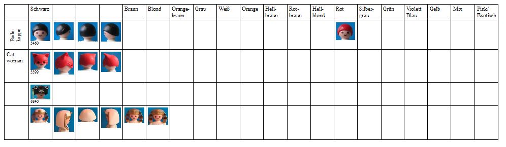 • Haare, die am Hinterkopf gehalten werden, 5 Typen: Dr. X (Super 4), Sir Ulf (Super 4), Grimmagus (Super 4, auch Figuren Scooby Doo), Doc (Zurück in die Zukunft) und B.A. (A-Team, kommt bald).
