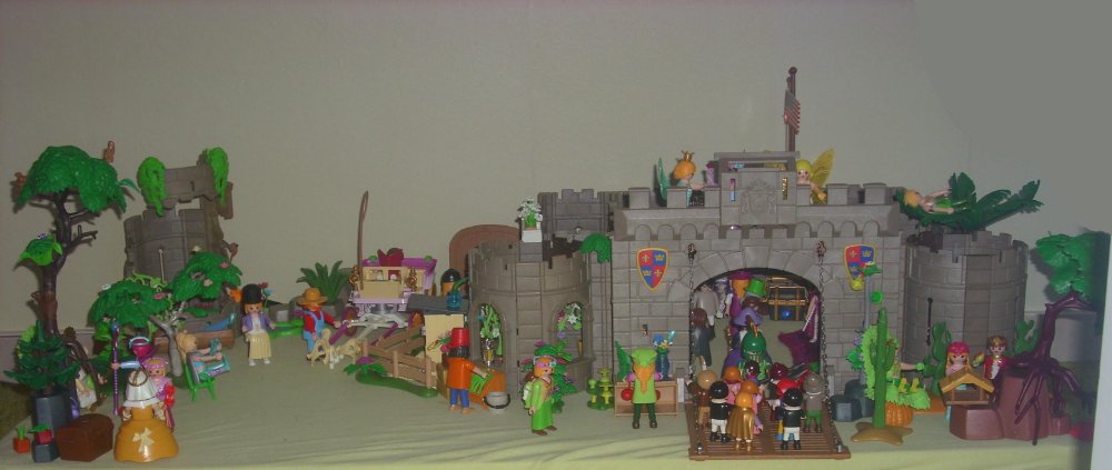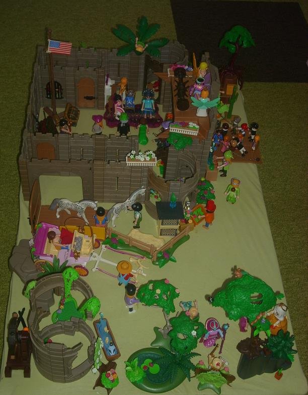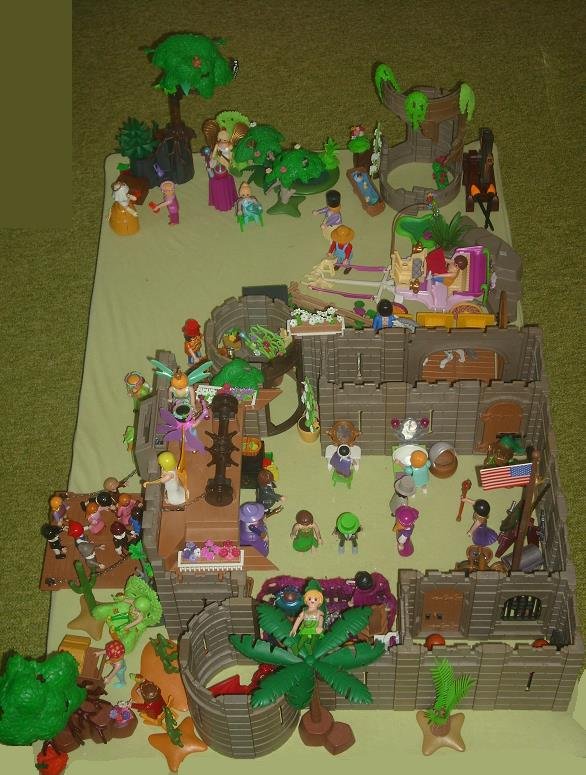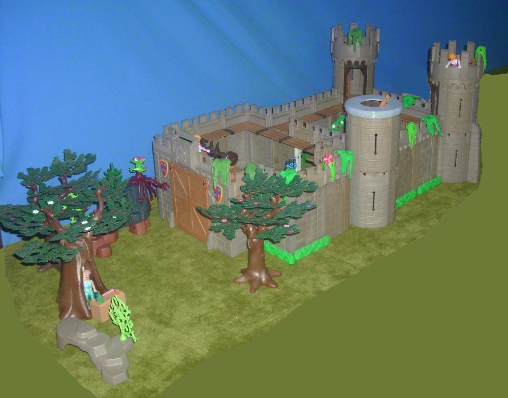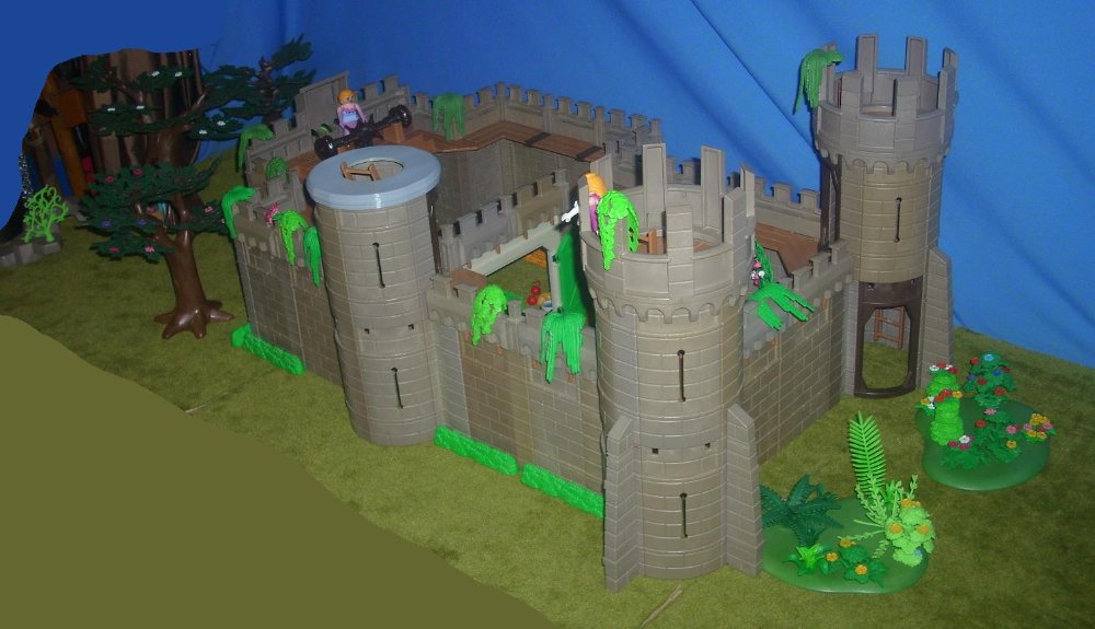 Es ist mal wieder so weit, daß meine Siebenjährige eine neue Burg samt Mini-Ruine aufgebaut und mit vielen Blumen und sonstigen Gewächsen verschönert hat. Außerdem mußte ich bestimmt ein Dutzend von ihren Figuren für sie zerlegen, damit sie diese neu zusammenstecken konnte.