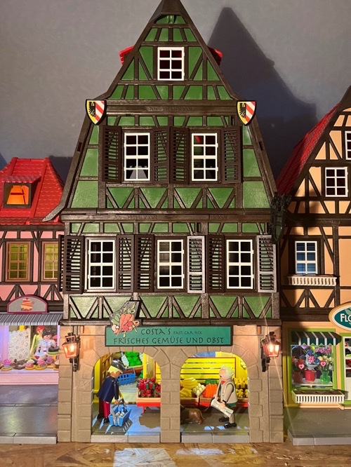 In dem grünen Haus ist ein Gemüse und Obst Händler eingezogen
