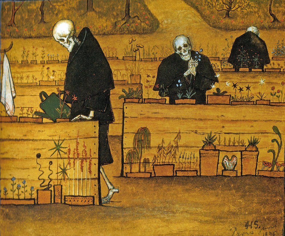 Der Tod als Gärtner - dieses Motiv erinnert mich an das Aquarell "Im Garten des Todes" des finnischen Malers Hugo Simberg, der hier Motive des Märchens "Geschichte einer Mutter" von Hans Christian Andersen verarbeitet. Chris Scharrer ist eine bleiche Schönheit und ihr einfaches weißen Hemd ist ein Totenhemd. Weiß gilt unter anderem in Asien bzw. in buddhistisch geprägten Ländern bis heute als Trauerfarbe.