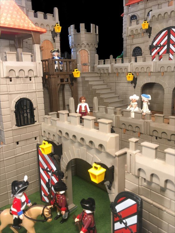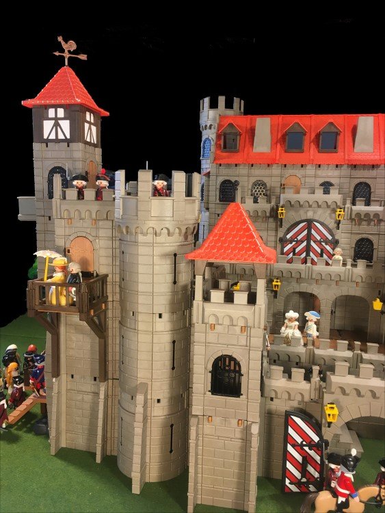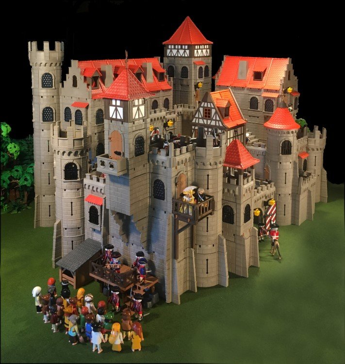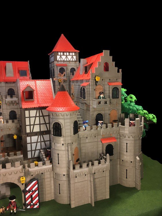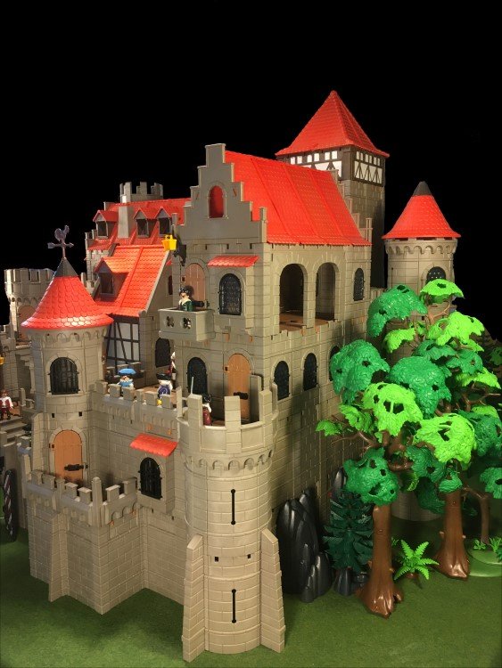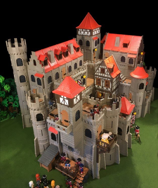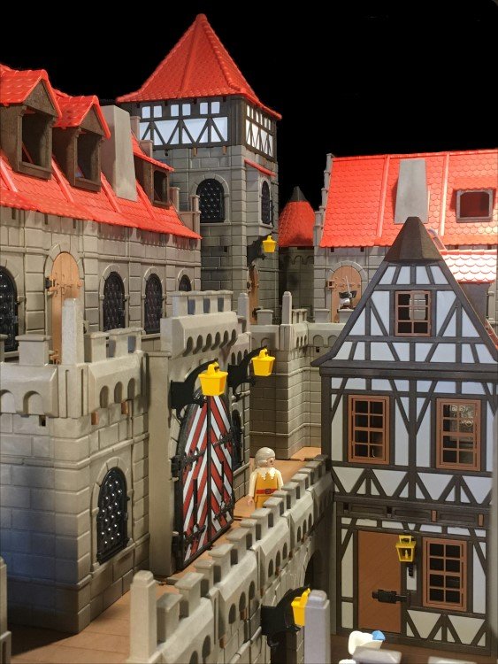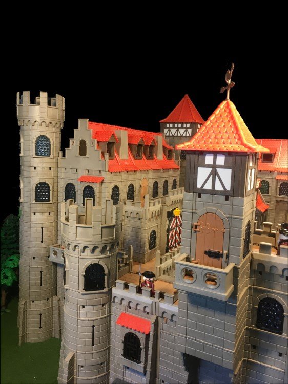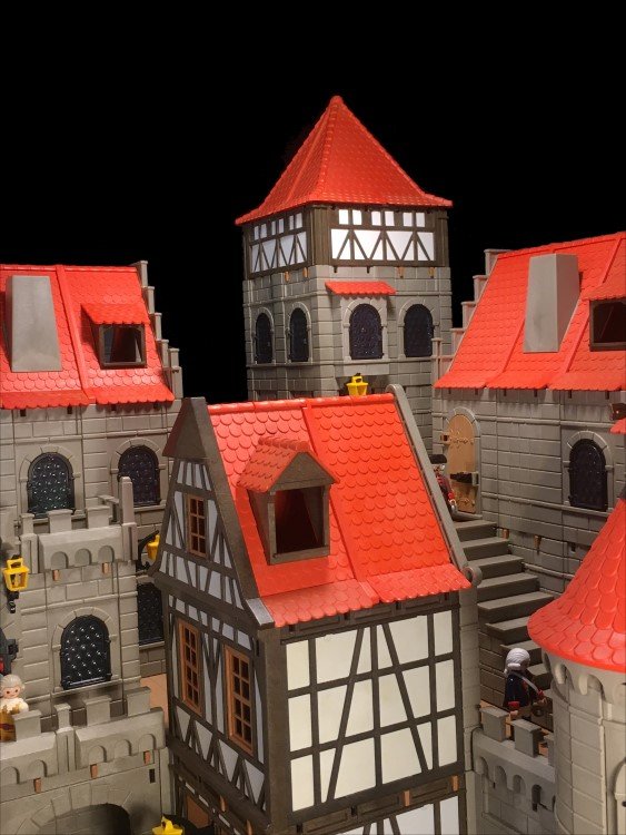 Einen Rundturm habe ich gekuerzt, dafuer 2 weitere Rundtuerme angefuegt. Das Fachwerkhaus habe ich auch minimalst gedreht, so dass die geschlossenen Waende nach vorne schauen. Jetzt hat die Burg fuer meinen Geschmack genug "Ecken und Kanten"... zumindest fuer jetzt![]()