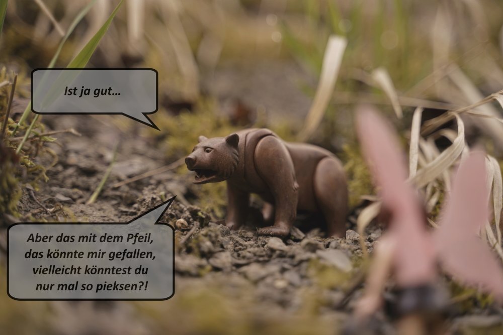 Am Morgen als ich die Bilder machen gehen wollte ist mir aufgefallen das die Gute dem Bären erzählt sie hätte ihm ein Steak eingepackt, sie aber gar keinen Rucksack o.ä. dabei hat, daher hat der Köcher kurzerhand eine Tasche bekommen, also nicht das ich mich so richtig um Realismus kümmern würde aber ich dachte das macht mehr Sinn :wink