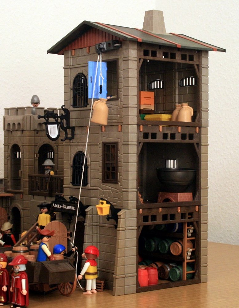 Die Brauerei wurde in einem alten Turm untergebracht. Oben liegt der Lagerboden für Hopfen und Malz, in der Mitte der Sudkessel und die Gärfässer, im Erdgeschoß der Lagerkeller. Die Brauerei erhält gerade eine Material-Lieferung.