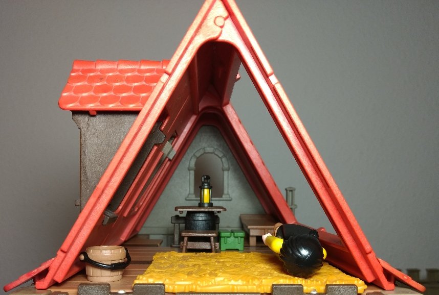 Offen ist auch noch, wie ich das halbrunde Dach der Aspis gestalte. Da ich die Fenster der oberen Reihe eigentlich nicht zubauen möchte, bleibt nur ein Eigenbau. Das Playmobil-Dach vom Rundturm ist zu steil und damit zu hoch. Da habe ich noch keine Idee. Das Pappmodell dient mir nur als Anhaltspunkt für die Größe. Möglicherweise bau ich nur den Dachstuhl aus Balken. Dann findet gerade eine Renovierung statt.