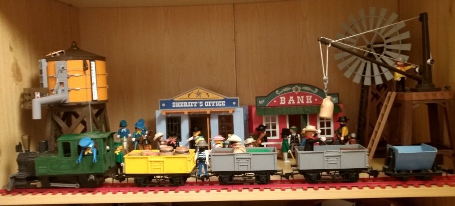 Durch das Auffüllen der Fundgrube könnte ich nicht wiederstehen einen weiteren Regalboden im Schrank für ein kleines Western-Dio freizuräumen. Der Zug vorne ist von Lima Giumba. und vom Maßstab her zu klein. Das hat mich als Kind nie gestört. Nach 40 Jahren im Keller leider nicht mehr funktionsfähig