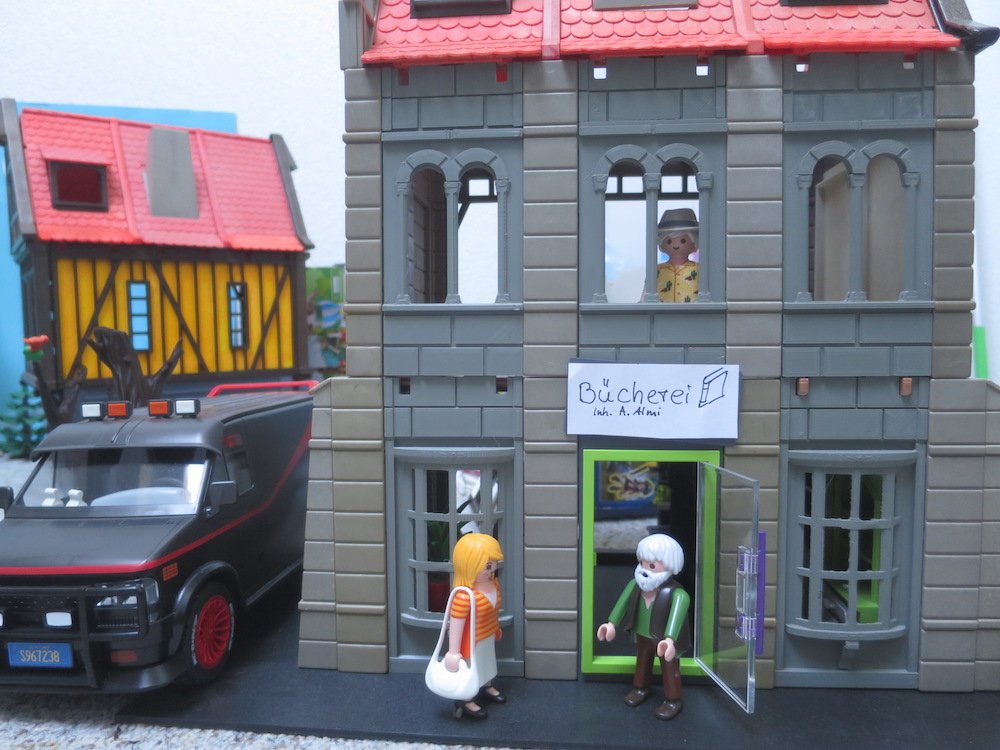 ich habe den Buchladen nochmal überarbeitet und die Spielwaren integriert. Leider ist der Laden innen noch zu dunkel. Und ich habe noch kein gut klebenes doppelseitiges Tesa gefunden, das :grinsen auf Plastik klebt. Nun ja geht nicht nur mir so, sondern auch oft bei den kleinen Playmobil-Orginalaufklebern für die Lebensmittel.