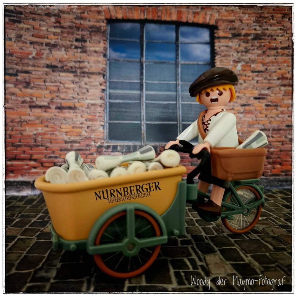 Ein Nürnberger Zeitungs-Junge unterwegs mit seinem Lastenrad...