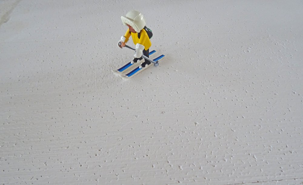 drei Generationen Playmo-Pistenraupen hintereinander + Hubschrauberlandeplatz