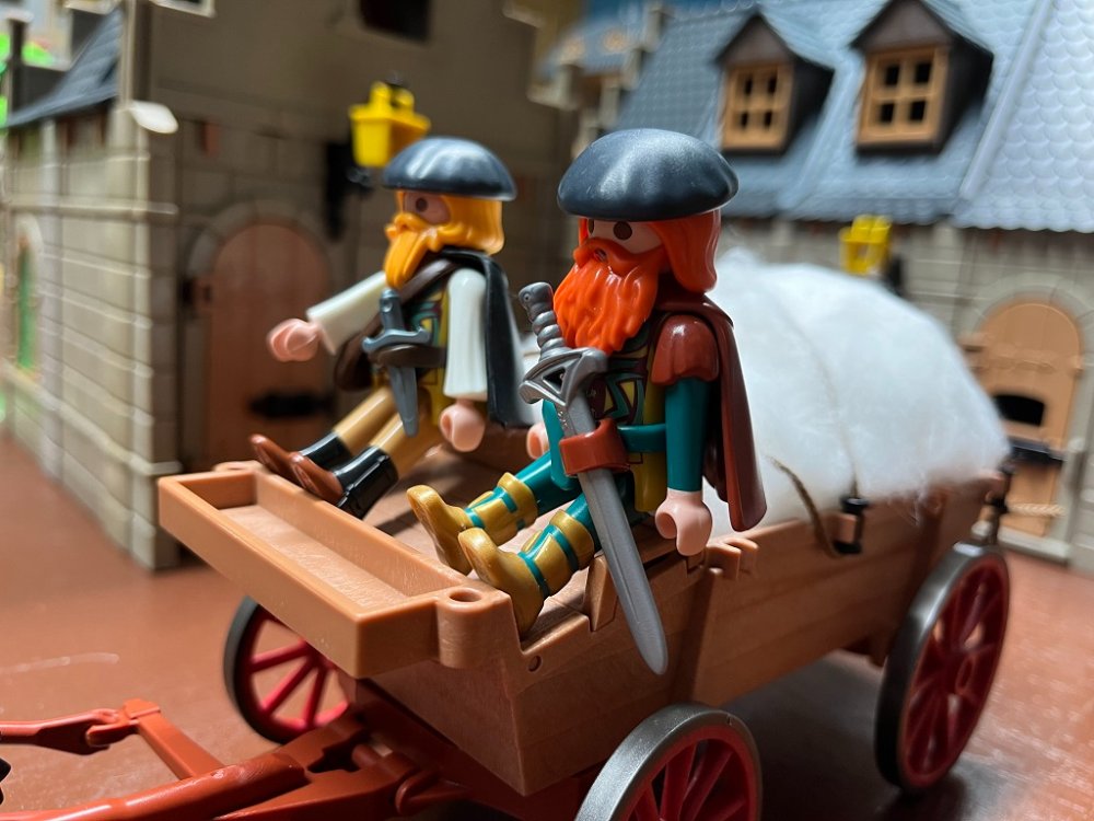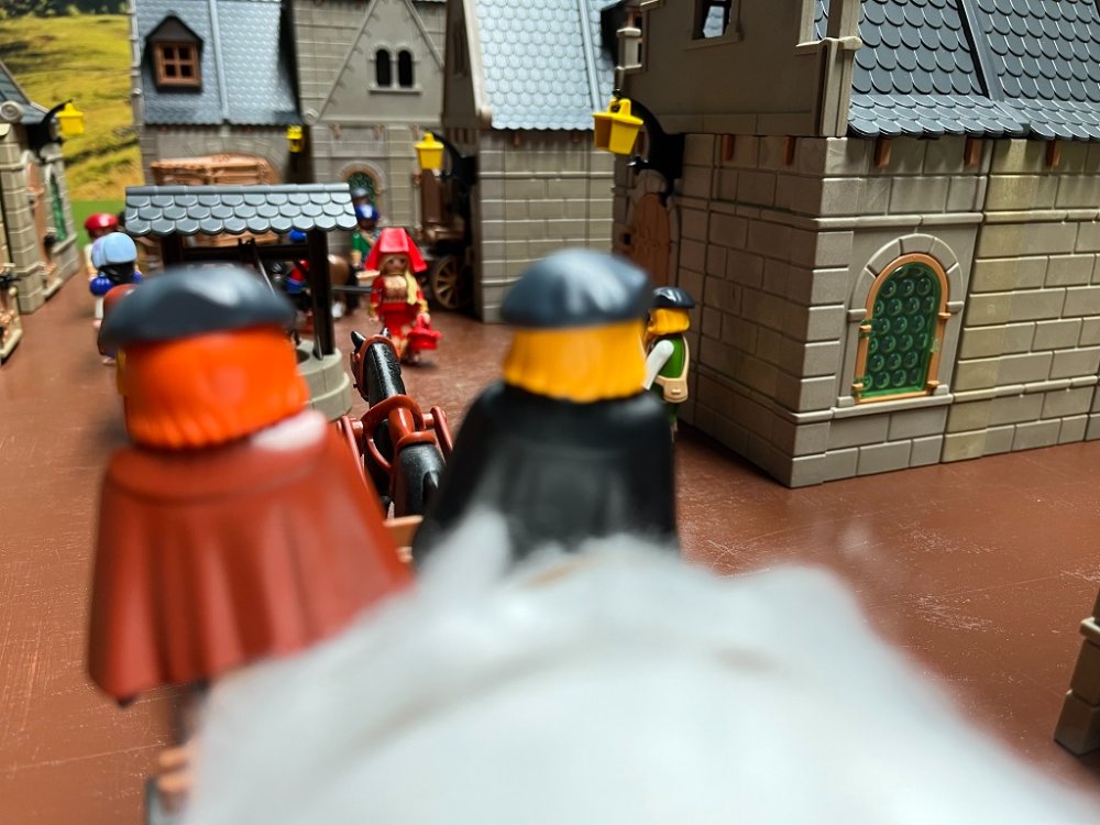 auf dem Weg zum Markt durch das Dorf schlenderte, und den Weg der beiden Brüder kreuzte.
