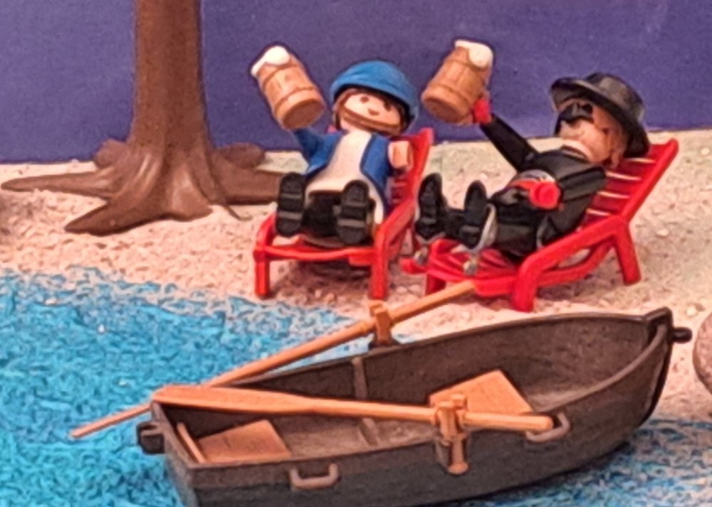 Am See an der großen Tanne haben es sich Fischkopp Claas und Playmo-Fritz in den Liegestühlen gemütlich gemacht. Ein kühles Bier darf auch nicht fehlen.