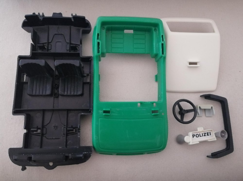 Hm, der schwarze Unterbau ist n.i.O (nicht in Ordnung). Der grüne Rahmen ist Ok, wenn auch zerkratzt. Die Bauteile rechts davon sind i.O. (in Ordnung). Es fehlt eine schwarze Frontscheibe, zwei mal Achse/Felge/Reifen (metall/weiß/schwarz) und ein intakter Unterbau.