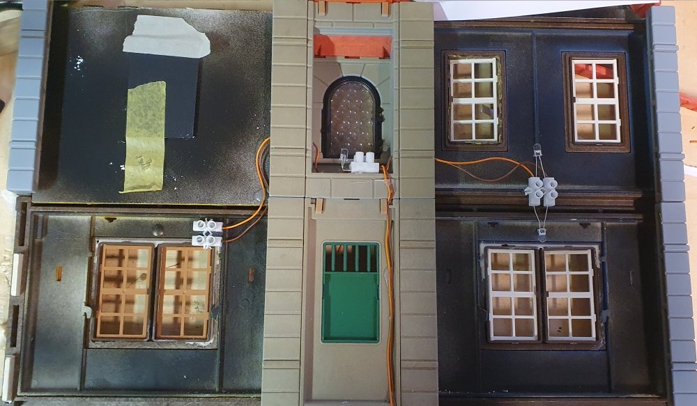 Der versierte Modellbahner weiß, daß das helle Licht in der Regel durch den dünnen Kunststoff durchscheint. Damit das nicht passiert, hab ich die Wandteile von hinten geschwärzt.