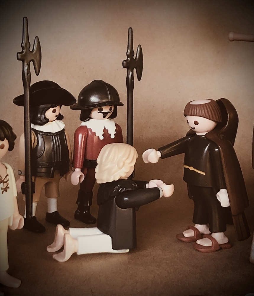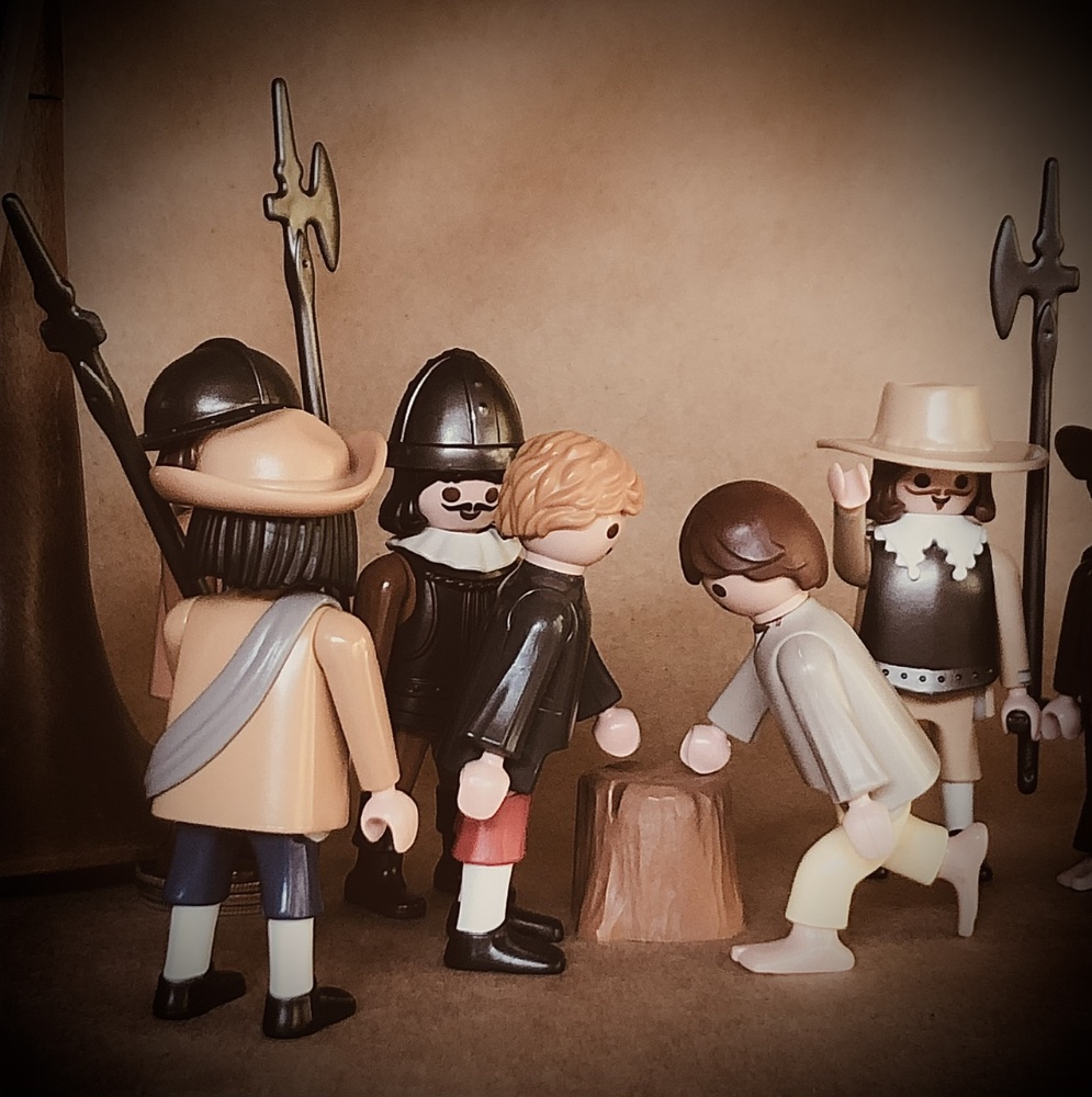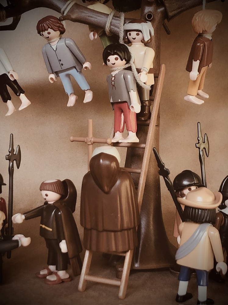 (aus Wikipedia) Der Galgenbaum“, aus dem 18-teiligen Radierzyklus „Die großen Schrecken des Krieges“ (Les Grandes Misères de la guerre), nach Jacques Callot (1632). Die Abbildung zeigt die Exekution von „infamen und verlorenen“ Dieben (Voleurs infames et perdus) sowie vermutlich auch Marodeuren, die um ihr Leben würfeln (in der Abb. rechts des Baums). Die Maßnahme ist kein Willkürakt, sondern erfolgt vor versammelter Truppe (linker u. rechter Bildrand), im Beisein von Geistlichen. Der Akt entspricht dem damaligen Kriegsrecht zur Aufrechterhaltung der militärischen Disziplin.