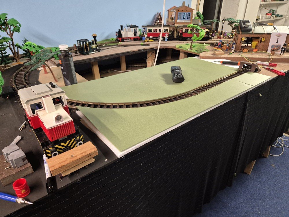 ...und aweng was draufstellen. Fest bebauen geht allerdings nicht, da das Programmiergleis so bleiben soll, daß ich bei Bedarf auch mal eine Lok flachlegen und aufmachen kann.