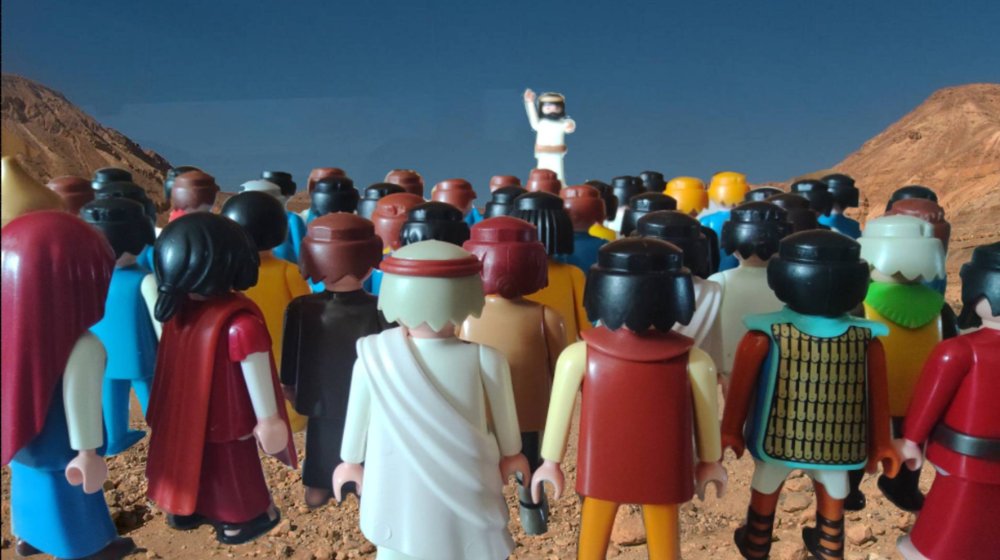 Als Jesus die vielen Menschen sah, stieg er auf einen Berg. Er setzte sich, und seine Jünger traten zu ihm.