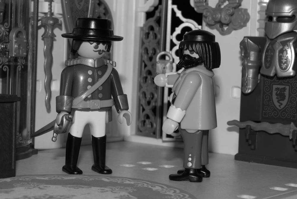 Luis: „ Ha, ha, eifersüchtig, wie? Der Höfling schlägt den Fechtmeister!“