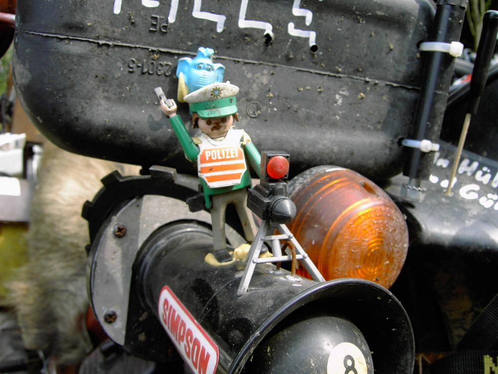 Heute war Schottenring-GP, ein Rennen für historische Motorräder, Baujahre 1900 - 1960 ungefähr. Bemerkenswert war auch der Zuschauerparkplatz, auf dem Foto ein sogenanntes Rat-Bike, verfault und verwest, aber trotz der Optik verkehrtüchtig. Man beachte die Details oder für Blinde das zweite Bild...
