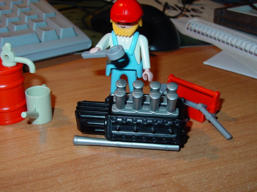 in einer Kruschkiste habe ich den Motor auf dem Bild gefunden. Wir sind uns nicht sicher, ob er Playmobil ist. Ich habe mal den Rest zum Größenvergleich dazugestellt.